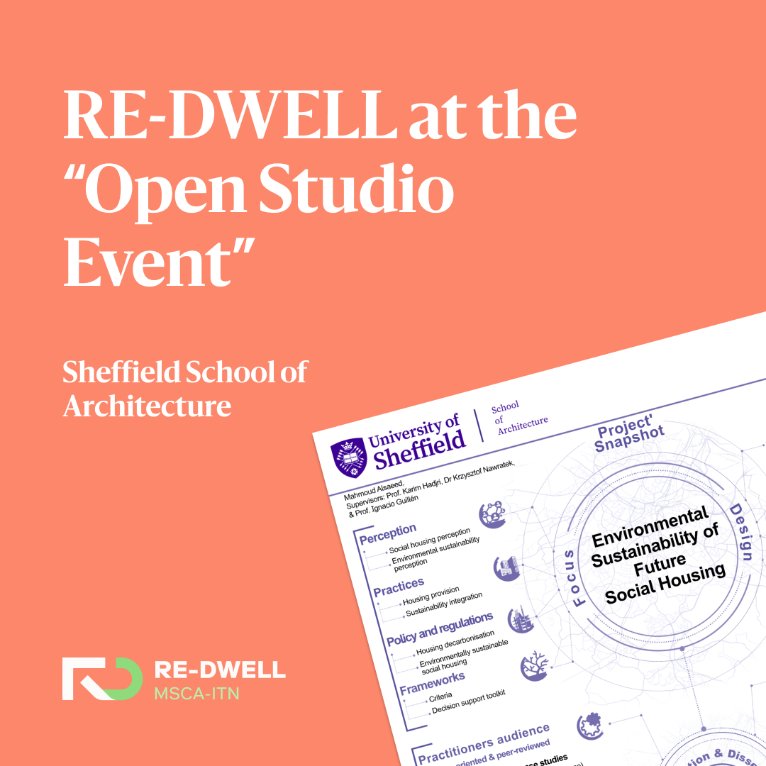 On February 1, 2024, the Open Studio Event took place at the Sheffield School of Architecture, giving students from across the programmes the opportunity to display their work. A PhD section consisted of posters submitted by a number of doctoral students currently at the School of Architecture. Here, RE-DWELL ESRs Mahmoud Alsaeed and Aya Elghandour submitted their posters to disseminate RE-DWELL and their individual projects.